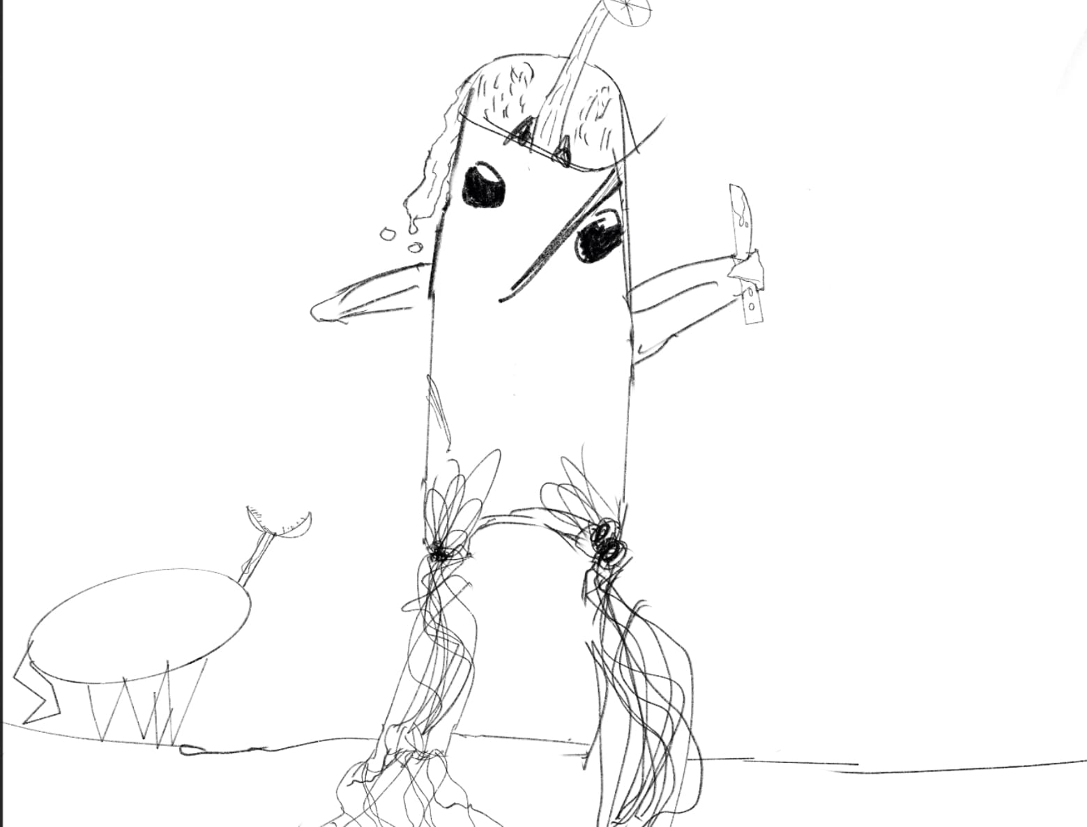I created a character a while ago their name is allium and they are a plant person who was combined with a pitcher plant. They eat people by throwing them into their mouth which is on the top of their head. They have a grass sword that can stretch really big and they can stretch the flower on their head. They eat people and are dangerous but they are also really nice! They wanna make freinds but they always end up accidentally eating them. Heres a drawing!