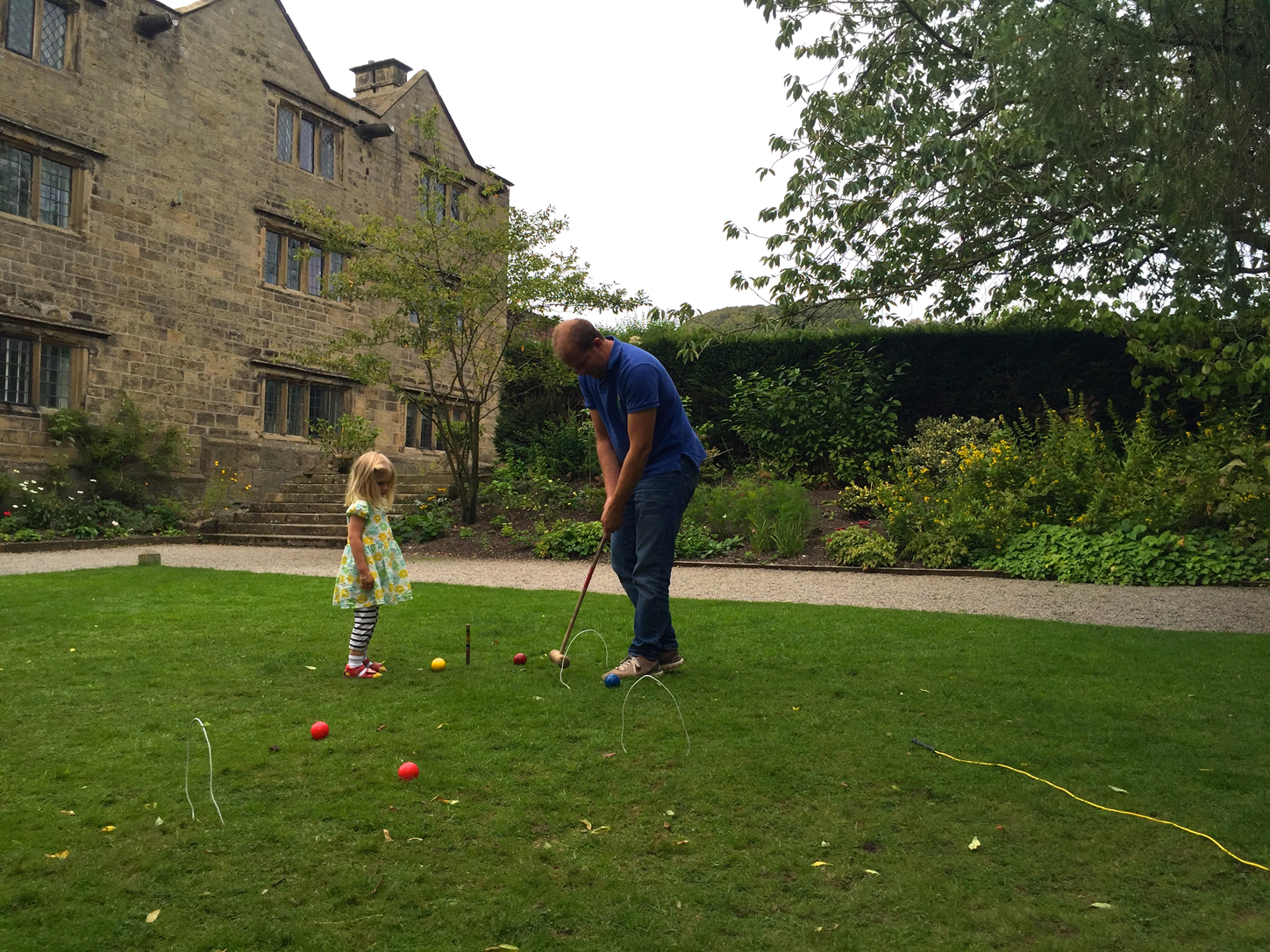 Altogether now: BOLSOVER! (Also, look at the size of that tree!)Luis looking very small and very content. (This isn't actually in Bolsover now that I think about it... See what I mean about all the places running together?!)SmallPaw in heaven since her favorite thing in the whole wide world right now is making plays. There are productions going on at least 5 times a day and we've had to start branching out from the regular "Cinderella" and "Rapunzel" stories. Now there's "Cinderella moves to London", "Rapunzel's birthday party" and "Snow-white bakes a cake". Any suggestions for further princess stories are welcome.Okay fine so it's not just SmallPaw who enjoys dressing up.Trying to keep a straight face (it seemed to be more appropriate for the attire).Princess SmallPaw will see you now.Little Prince Charming got himself a princess for each arm.Totally fearless that kid. (Thank god he came out again by himself. Neither one of us would have gone in to find him.)This was actually at a National Trust property in Eyam. SmallPaw kicked croquet butt.Watching deer in the rain. (Note the one standing on its hind legs to get at the tree branches!)