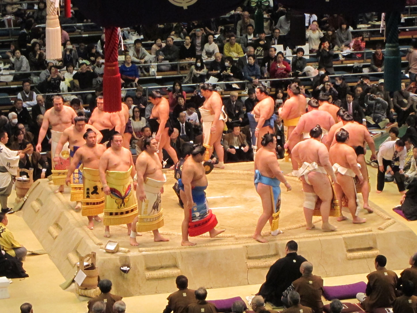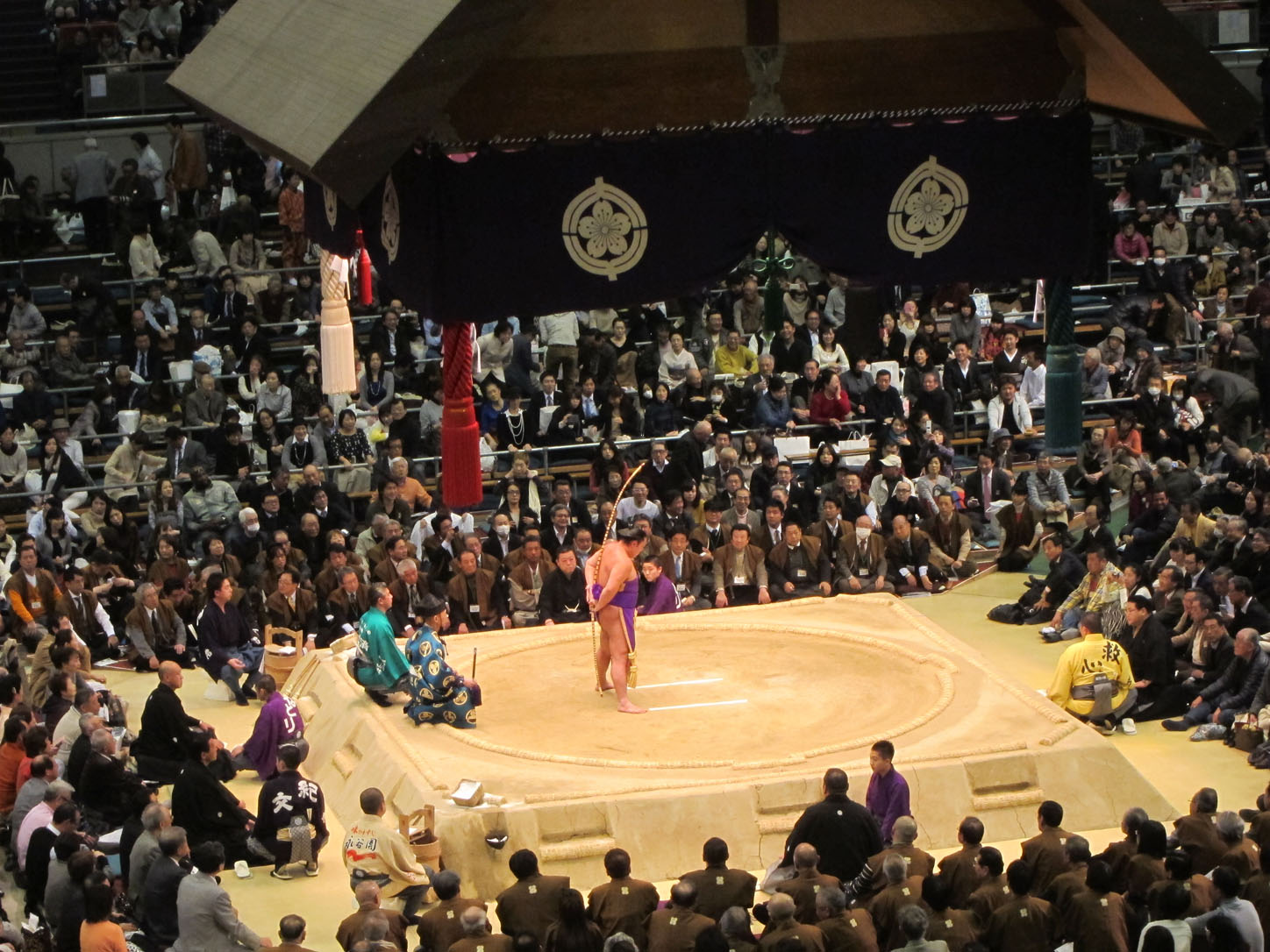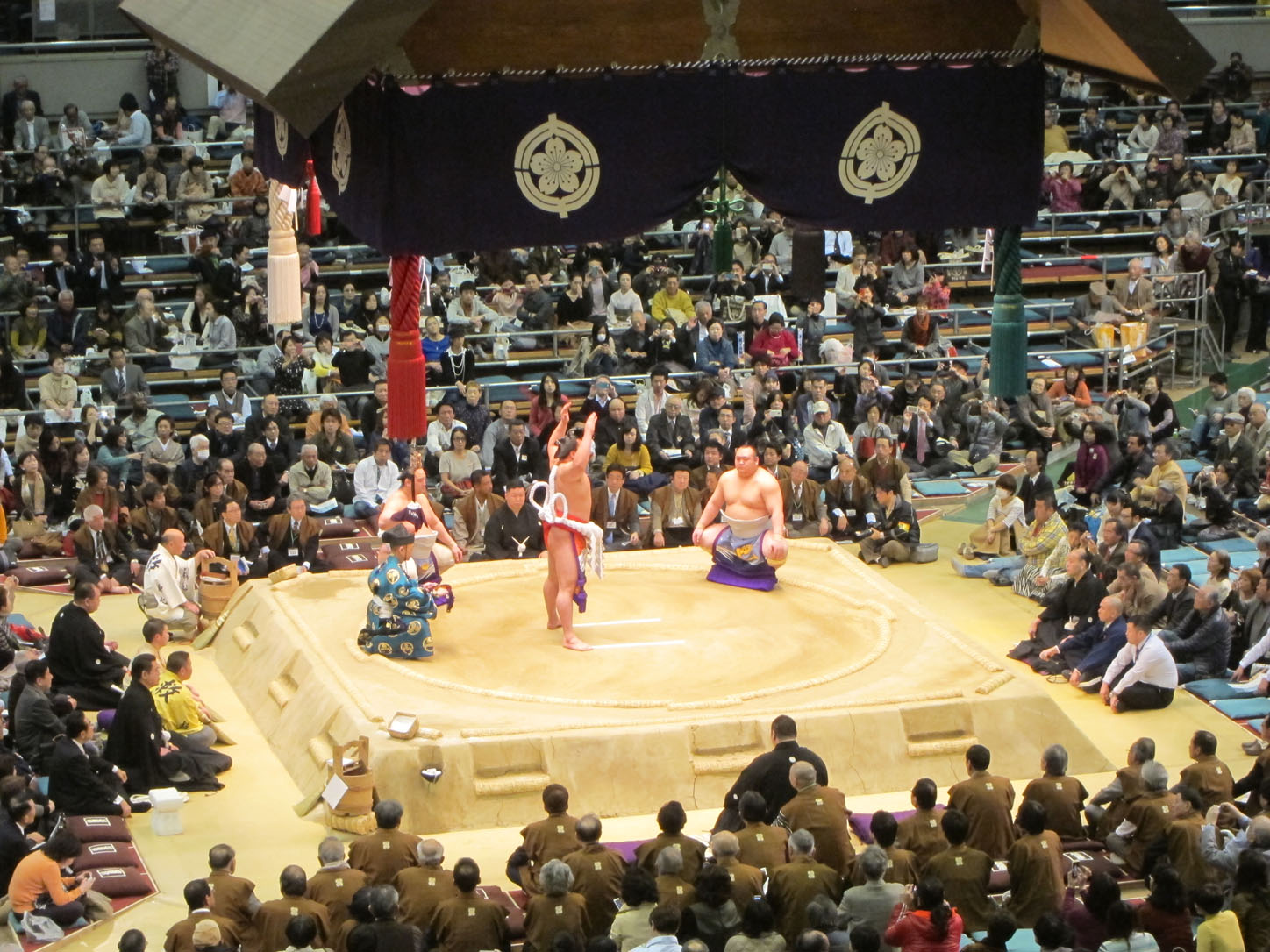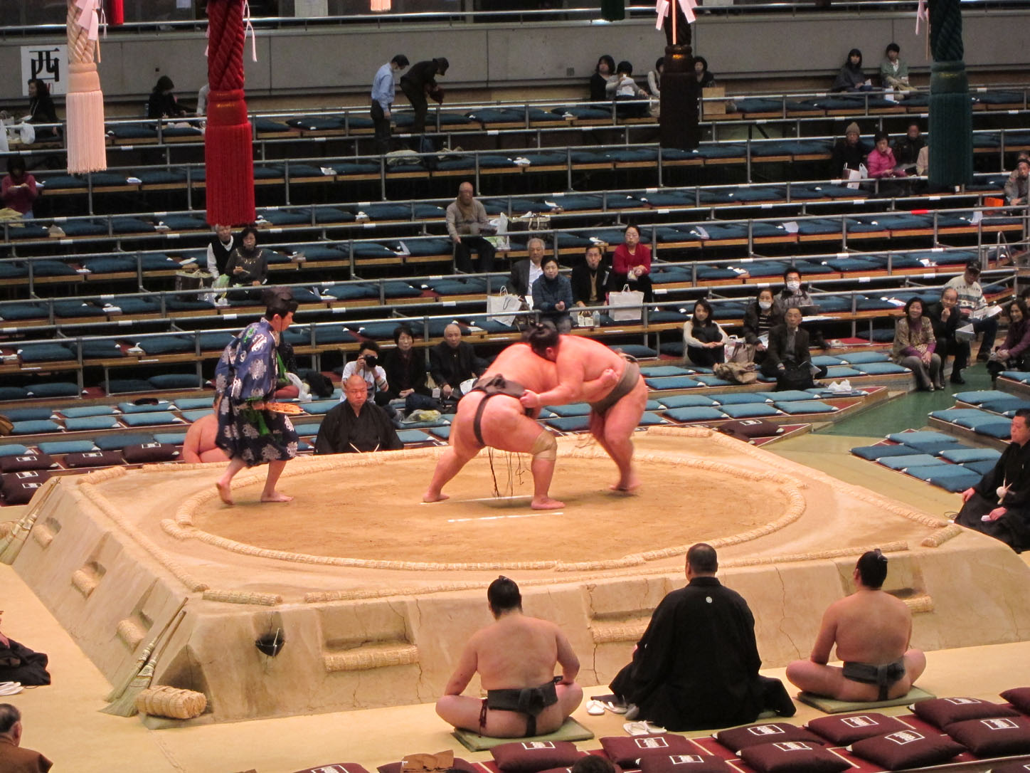 Each wrestler has a flag with his name outside the venue.All these trophies are awarded to the winner. The joke is that the emperor's cup, that giant one in the middle, is always to heavy and large for the puny prime minister to lift and the sumo wrestler has to 'help' him pick it up. This gets replayed every year to everyone's delight.We arrived at 2 and the hall was still mostly empty. Even though they'd been fighting since 9am that morning.The guy in the middle calls out the names and stables (yes, stables!) of the next two fighters. He does this in an eerie sing-song that would make any muezzin blush with envy.Our first fight. There were many, many more that afternoon...Sometimes the judge can't decide on a call or wants a second opinion from the line refs that sit around the sides. In that case they all jump up and hurry into the middle of the ring to confer. Apparently this also serves as a convenient leg-stretching break.Whenever a new division of fighters comes on they first enter the arena decked out in their finest aprons (paid for by their sponsors, just like Hunger Games) and they do a little dance that cracked me up to no end.Fighters enter from the east and the west.