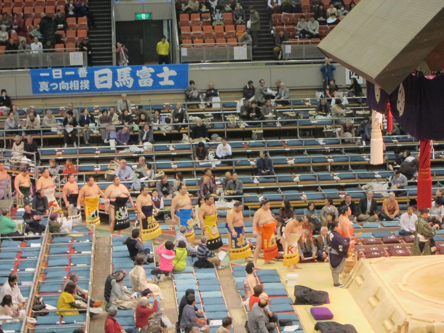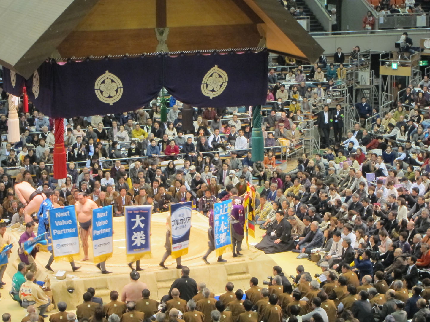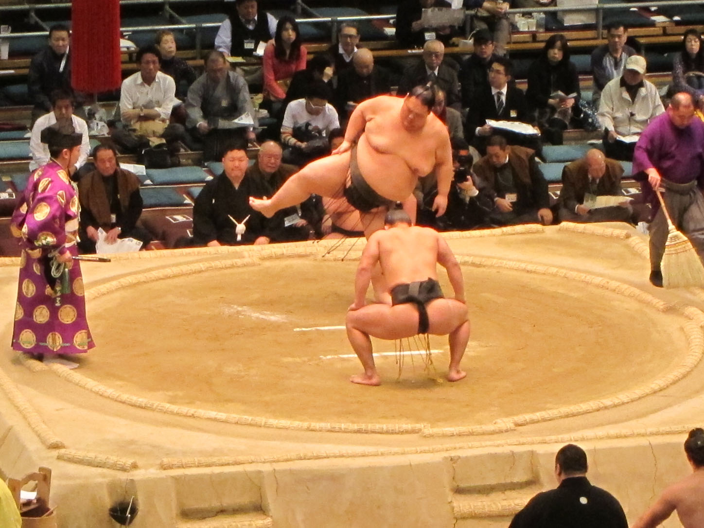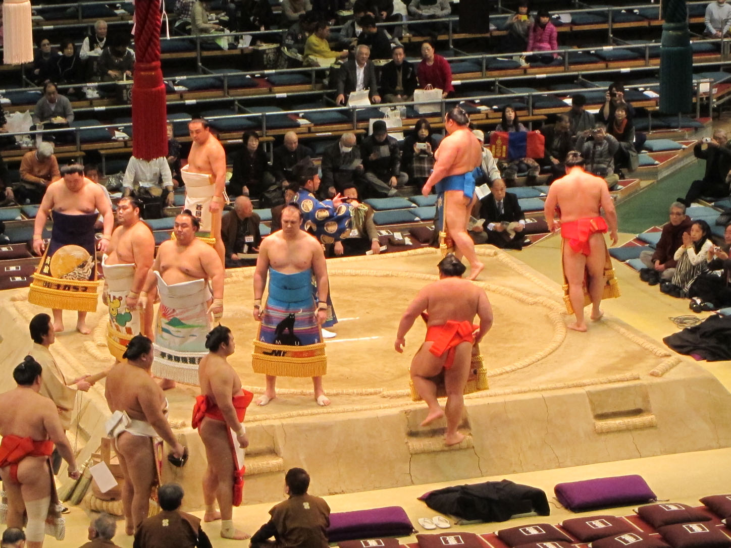 Each wrestler has a flag with his name outside the venue.All these trophies are awarded to the winner. The joke is that the emperor's cup, that giant one in the middle, is always to heavy and large for the puny prime minister to lift and the sumo wrestler has to 'help' him pick it up. This gets replayed every year to everyone's delight.We arrived at 2 and the hall was still mostly empty. Even though they'd been fighting since 9am that morning.The guy in the middle calls out the names and stables (yes, stables!) of the next two fighters. He does this in an eerie sing-song that would make any muezzin blush with envy.Our first fight. There were many, many more that afternoon...Sometimes the judge can't decide on a call or wants a second opinion from the line refs that sit around the sides. In that case they all jump up and hurry into the middle of the ring to confer. Apparently this also serves as a convenient leg-stretching break.Whenever a new division of fighters comes on they first enter the arena decked out in their finest aprons (paid for by their sponsors, just like Hunger Games) and they do a little dance that cracked me up to no end.Fighters enter from the east and the west.