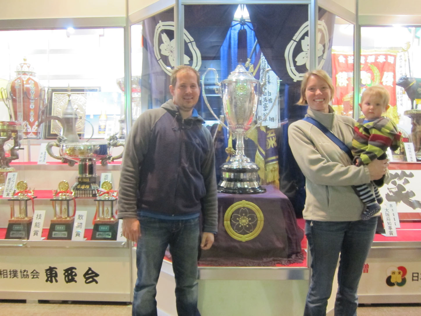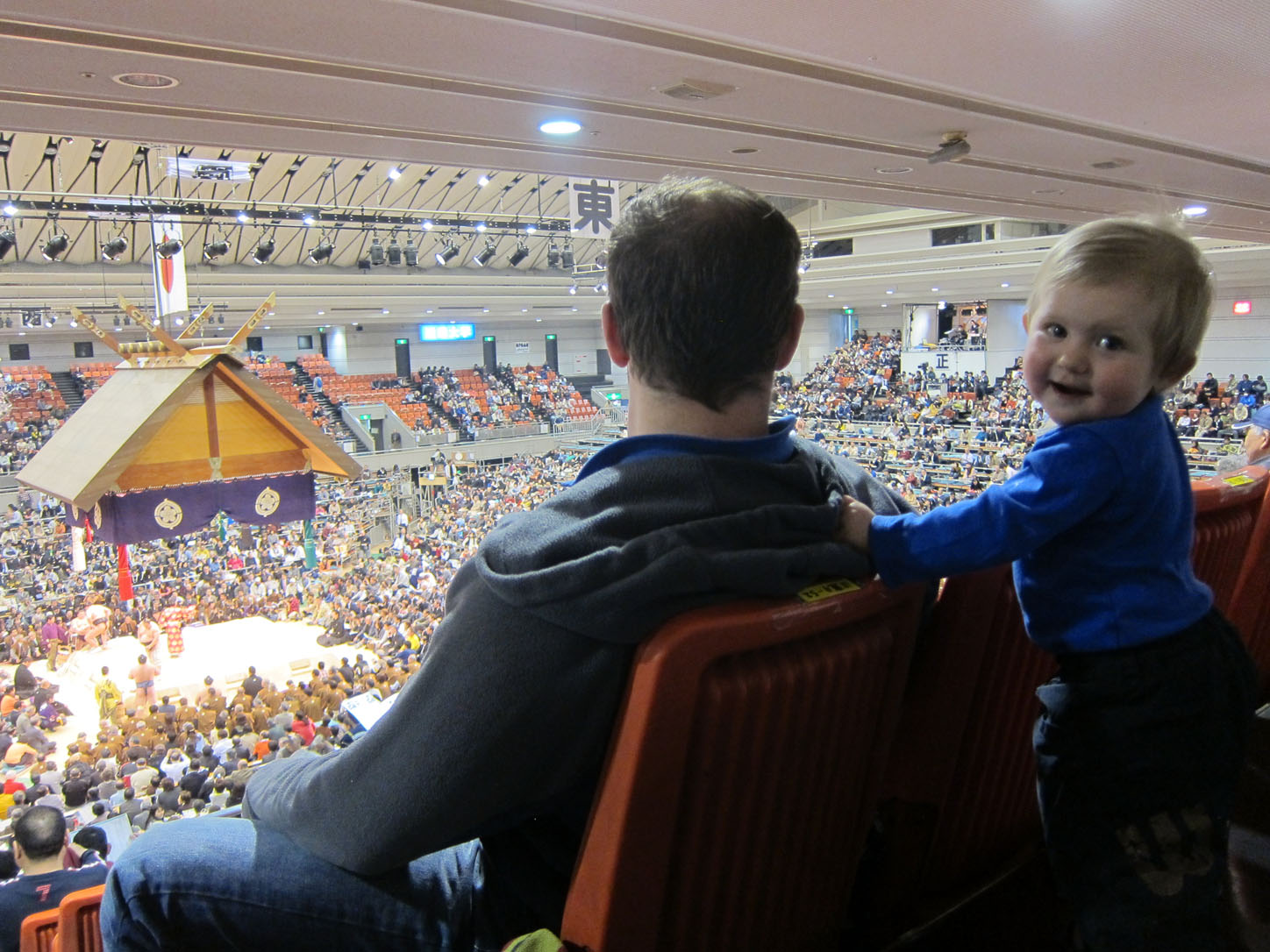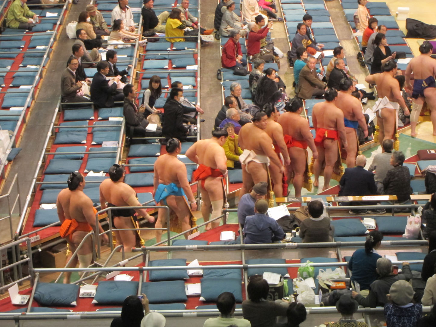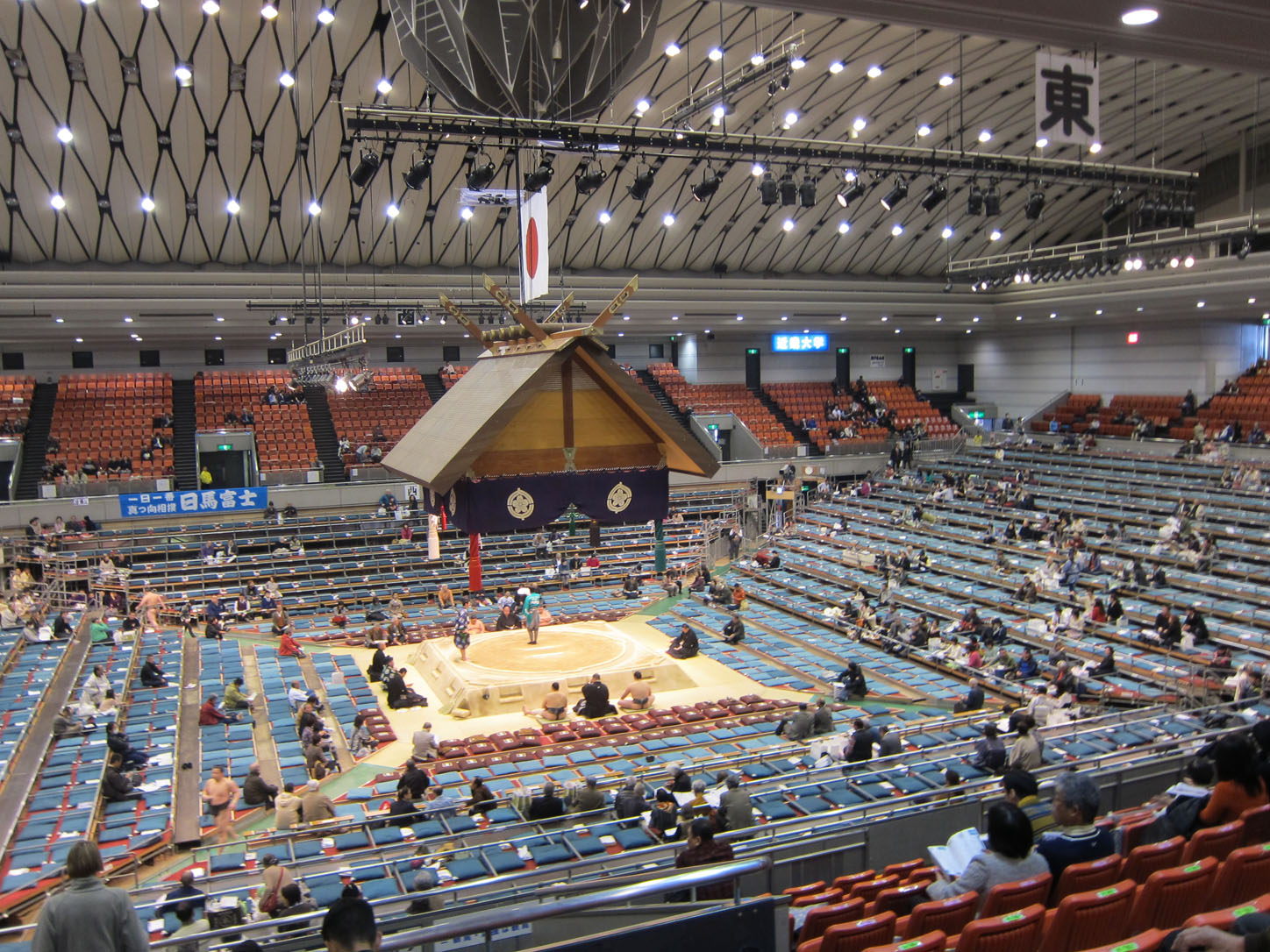 Each wrestler has a flag with his name outside the venue.All these trophies are awarded to the winner. The joke is that the emperor's cup, that giant one in the middle, is always to heavy and large for the puny prime minister to lift and the sumo wrestler has to 'help' him pick it up. This gets replayed every year to everyone's delight.We arrived at 2 and the hall was still mostly empty. Even though they'd been fighting since 9am that morning.The guy in the middle calls out the names and stables (yes, stables!) of the next two fighters. He does this in an eerie sing-song that would make any muezzin blush with envy.Our first fight. There were many, many more that afternoon...Sometimes the judge can't decide on a call or wants a second opinion from the line refs that sit around the sides. In that case they all jump up and hurry into the middle of the ring to confer. Apparently this also serves as a convenient leg-stretching break.Whenever a new division of fighters comes on they first enter the arena decked out in their finest aprons (paid for by their sponsors, just like Hunger Games) and they do a little dance that cracked me up to no end.Fighters enter from the east and the west.