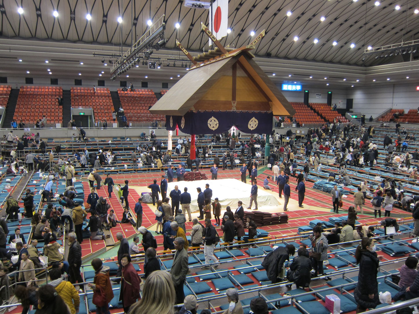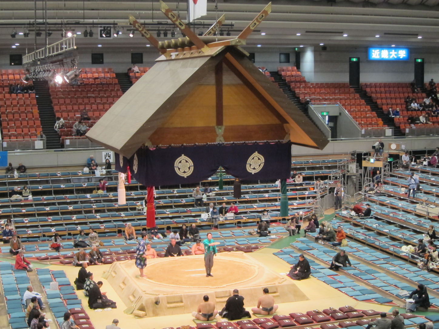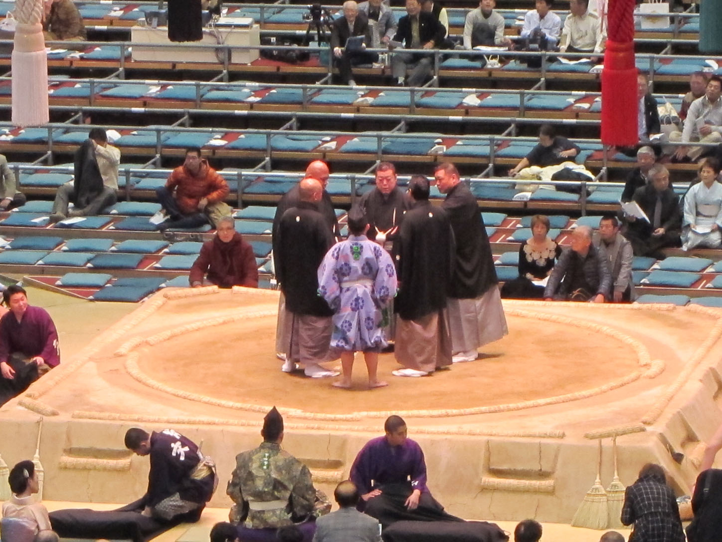The venue in Osaka is a regular sports arena, usually used for basketball. They simply put up scaffolding for the little box seats (those are the pricey ones not just because they are closer to the ring but you also get massive amounts of food and hot tea) and erect a ring in the middle. The ring is actually a mound of clay so as the days go on cracks begin to appear in it and it has to be patched up every once in a while. Because sumo wrestling is such an old sport there are hundreds of arcane rules and regulations that need to be observed, because tradition. I won't bore you with all the weird details we learned but I'll try and slip some in with the pictures.