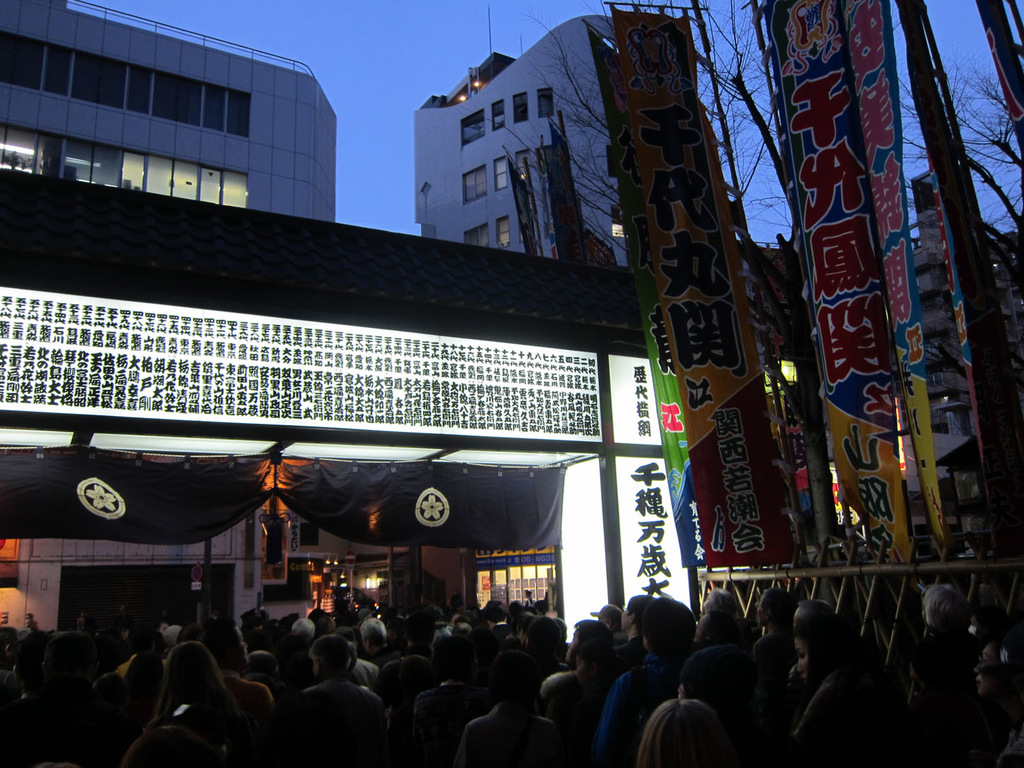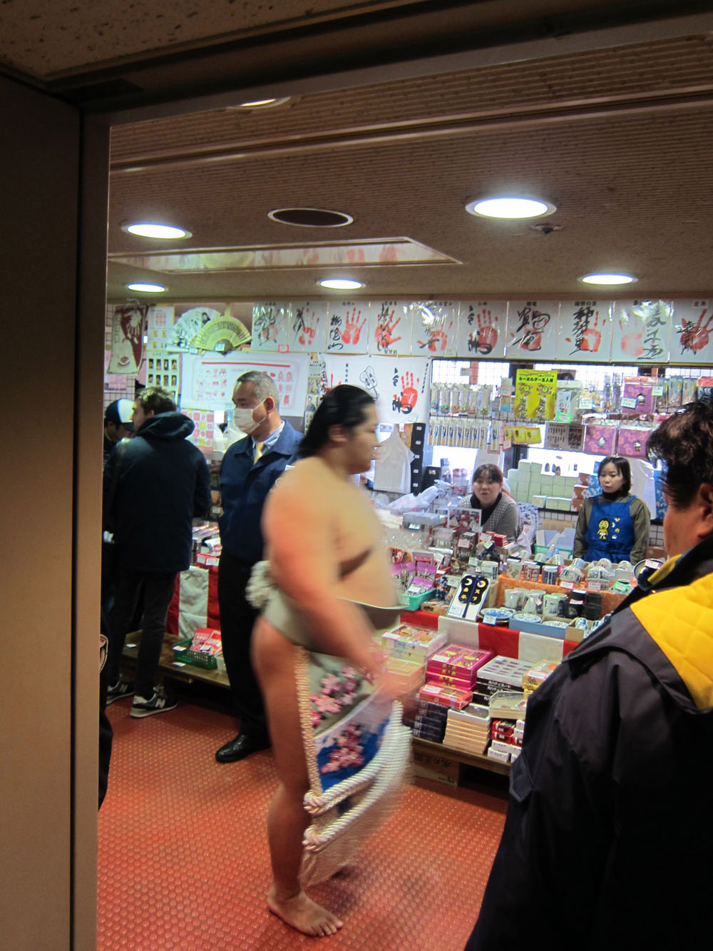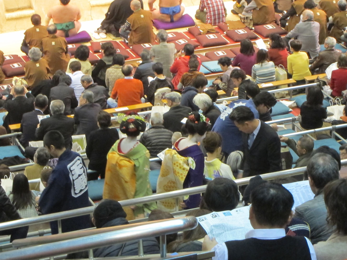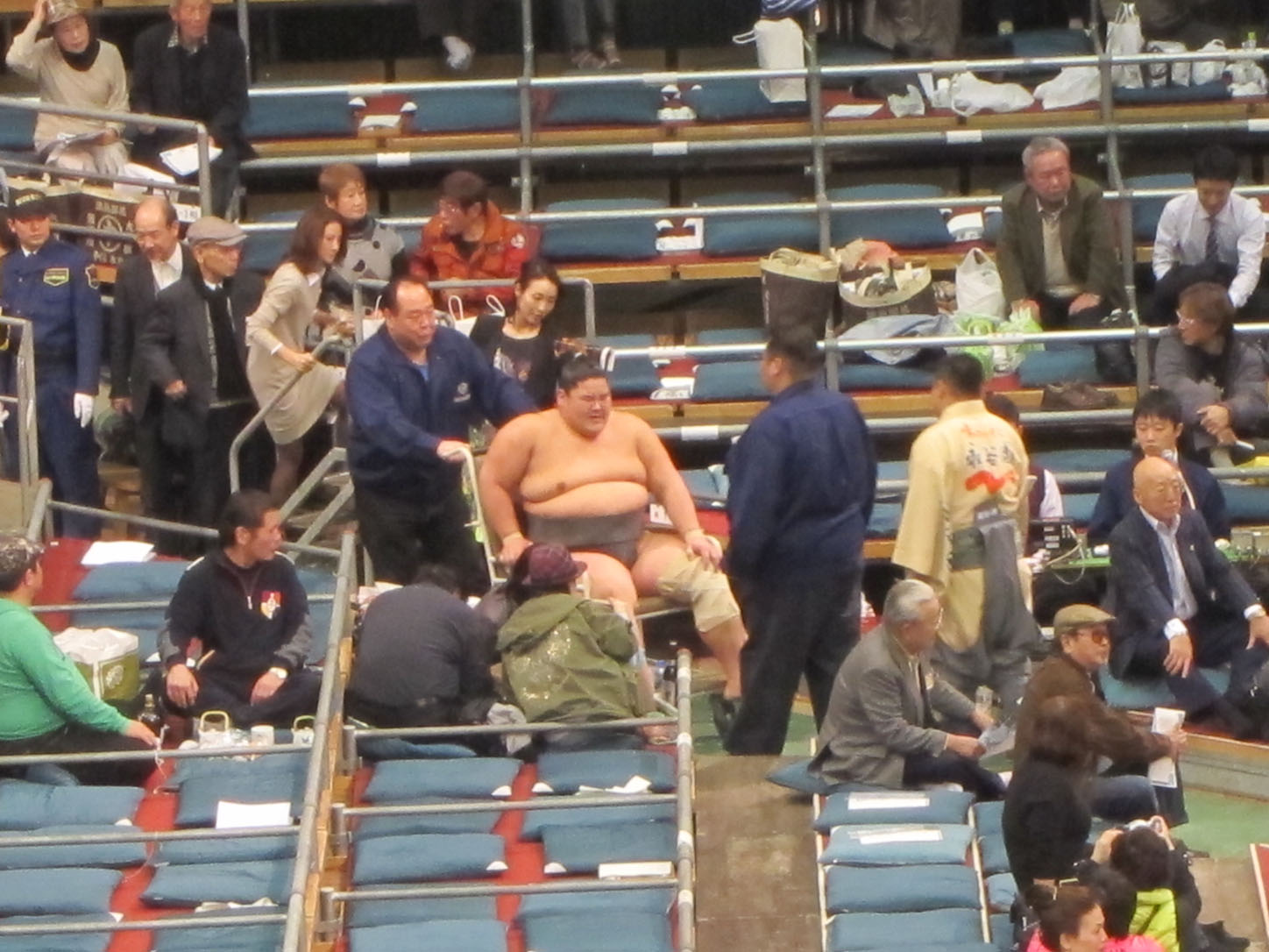 After they do their cute little dance, the walk around the ring once and then go back to the dressing room to take off the aprons and get ready.Endo, Japan's new hope for top fighter division or yokozuna. He has risen up the ranks so fast that his hair hasn't had time yet to grow out for the traditional ponytail hairdo.This guy got injured badly during the throw and couldn't walk anymore. So they brought in the most massive wheelchair I have ever seen.Maikos (apprentice geishas) made an appearance too. Possibly hired by the venue to make it look good on TV.Look at the difference in size! I was rooting for the little guy to win but he didn't have much of a chance agains the sheer bulldoze power of the other one.The guy with the blueish apron is Russian and ridiculously tall. Also quite well muscled for a sumo wrestler. A pleasant change on the eyes. :)One of the two yokozuna doing a special display dance after their big entry.During the fights for the final (highest) division, sponsors pay for ads to be carried around the ring before each fight. This one includes an ad for Bulgarian yoghurt, the sponsors of one of the Bulgarian fighters.Small Paw having a ball.The final dance, done by one of the fighters.As soon as the fat lady sings, or in this case the fat guy dances, the show is over and everyone is out of there as if their asses were on fire. This was taken not 5 minutes after the closing dance. All the guys in blue standing around the ring are ex-wrestlers now employed by the association to work venues during tournaments.Everyone rushing out to the subway, in a very orderly fashion of course. This is Japan after all. I think the writing above commemorates all the previous winners.