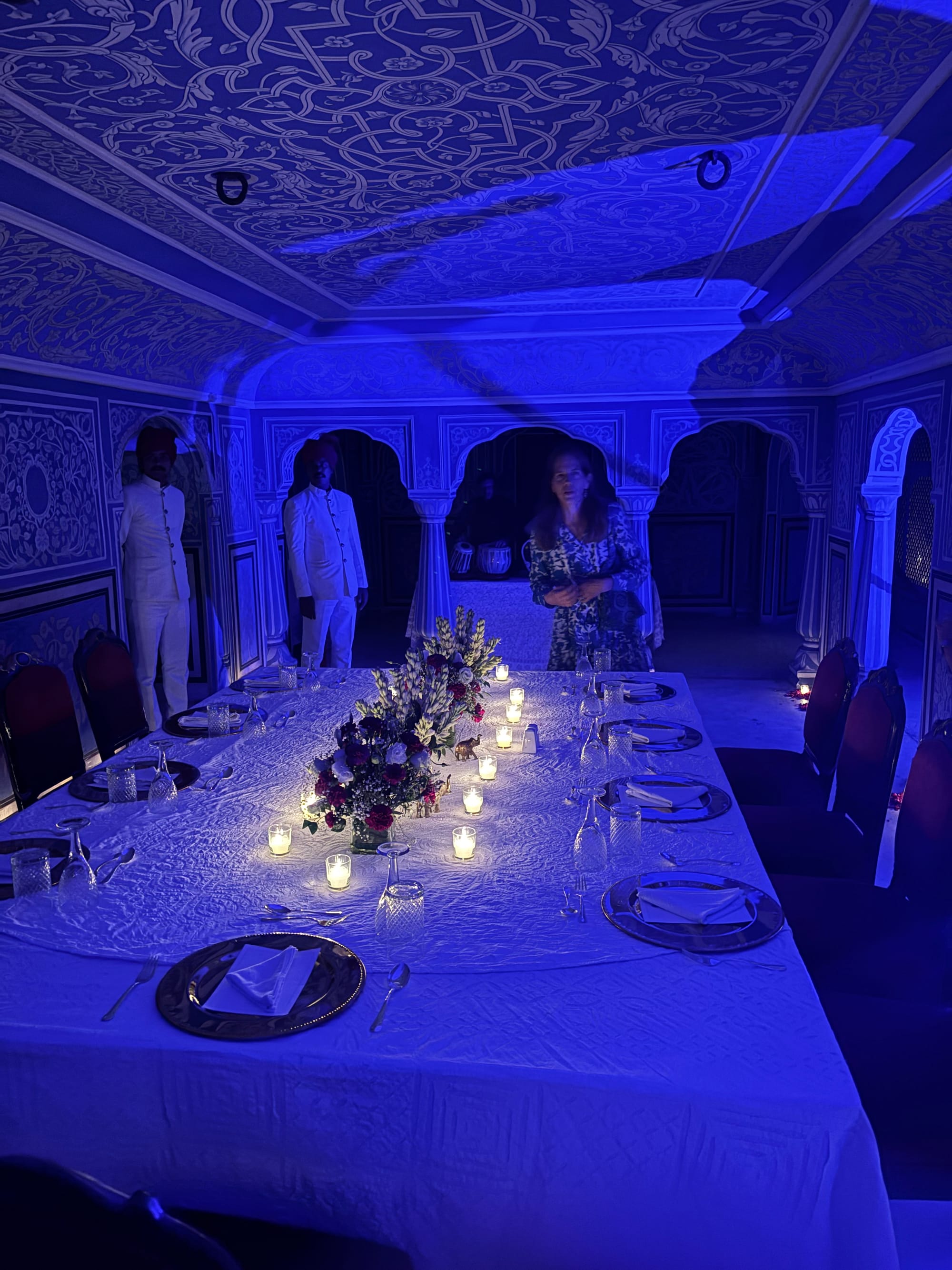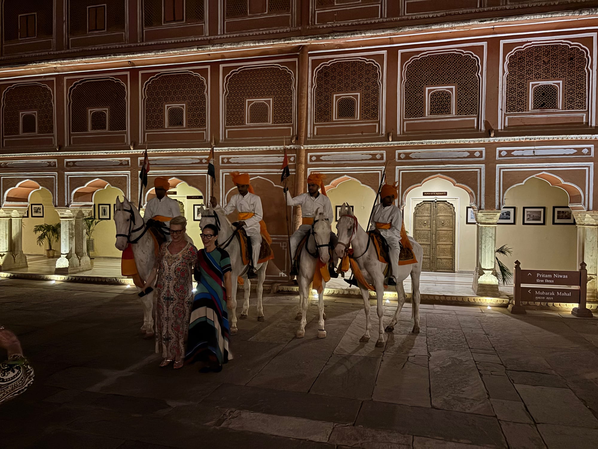 But now that I'm back everyone's obviously asking about India and want to hear what the most beautiful/amazing/memorable experience of the trip was and while that's a tough question to answer, because really the whole stay was all of the above, the one quintessentially magical and slightly bonkers experience was our dinner at the City Palace in Jaipur. We had already visited the palace during the day with all the other hundreds of tourists (read about that here) but being there at night, alone, with a palace guard escort is obviously a whole other kettle of fish. So as Oma Grete would have prompted: "Well, you arrived..."