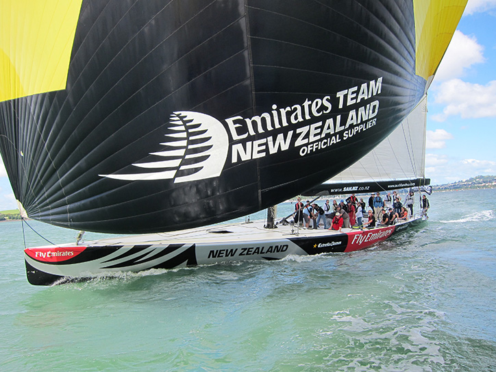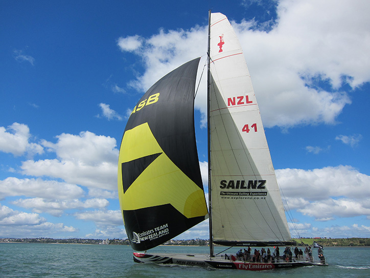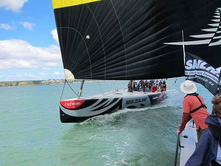 These are the opponents floating into the start box. The boats are the originals unchanged, except for an engine to avoid the need for towing and a small railing installed around the border to have something to hold on to and less tourists flying overboard. In a real crew everybody would have a job and most likely something they are holding on to, a sail, a rope, a winch or a rudder. They also use thicker sails as the America's cup originals only last 30 hours of use, in order to be extra light.