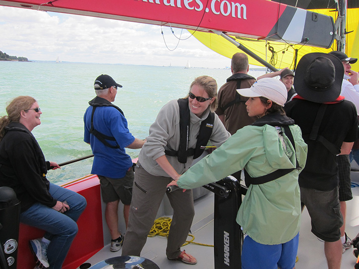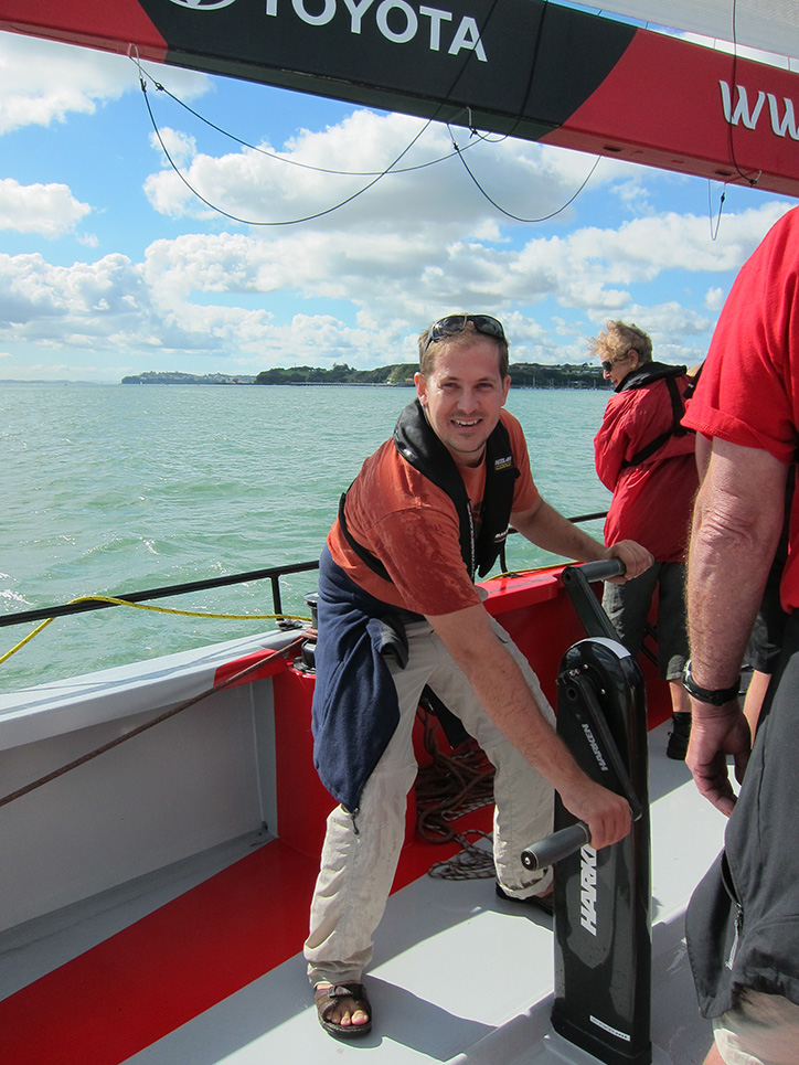 They have the NZL41 which raced in 2003 and is quite wide, and the NZL68 much thinner with tiny little rudders and harder to control. Nora was fascinated to be on either boat, but I wanted the newer boat so we ended up on the NZL68 (further away in the picture). After leaving harbor we trained grinding. Sails need to go up and be trimmed and all this requires a motor that is not available, hence why the grinding is key to success.