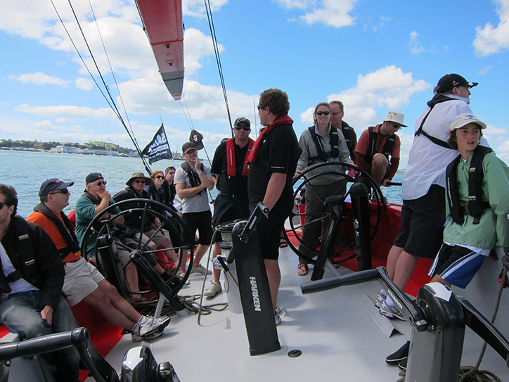 There are 4 stations which means 8 people grinding at a single time (2 per station on opposite sides). All 8 people can be used to raise the sails, or they can be unlinked and each team of 4 used independently to trim sails. I was on the back team that meant the main sail and commanded by Pedro (that we assumed to be a Spaniard with perfect English, for he was European). The rest of our professional crew included a New Zealand Skipper, the course setter also Kiwi, and then two English men for front sails, one had been a crew member in the past Volvo Ocean Race.