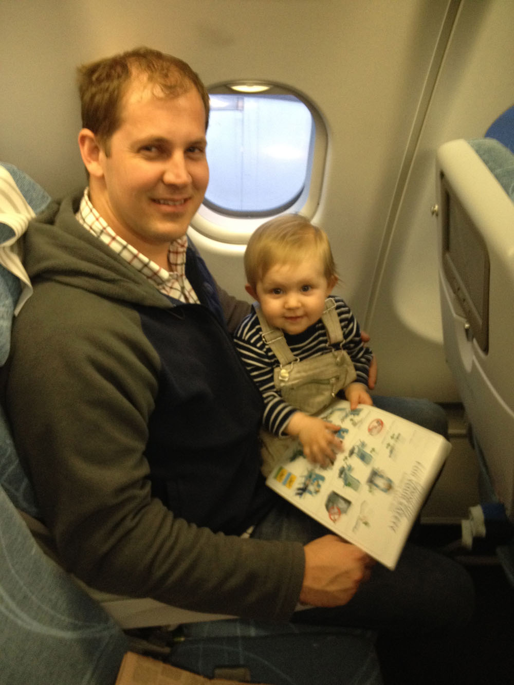 She slept for three hours in Fa's arms and nursed on a pretty continuous schedule but there was very little screaming or crying so overall a good flight.