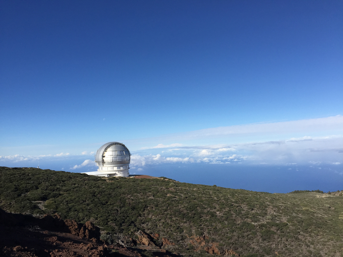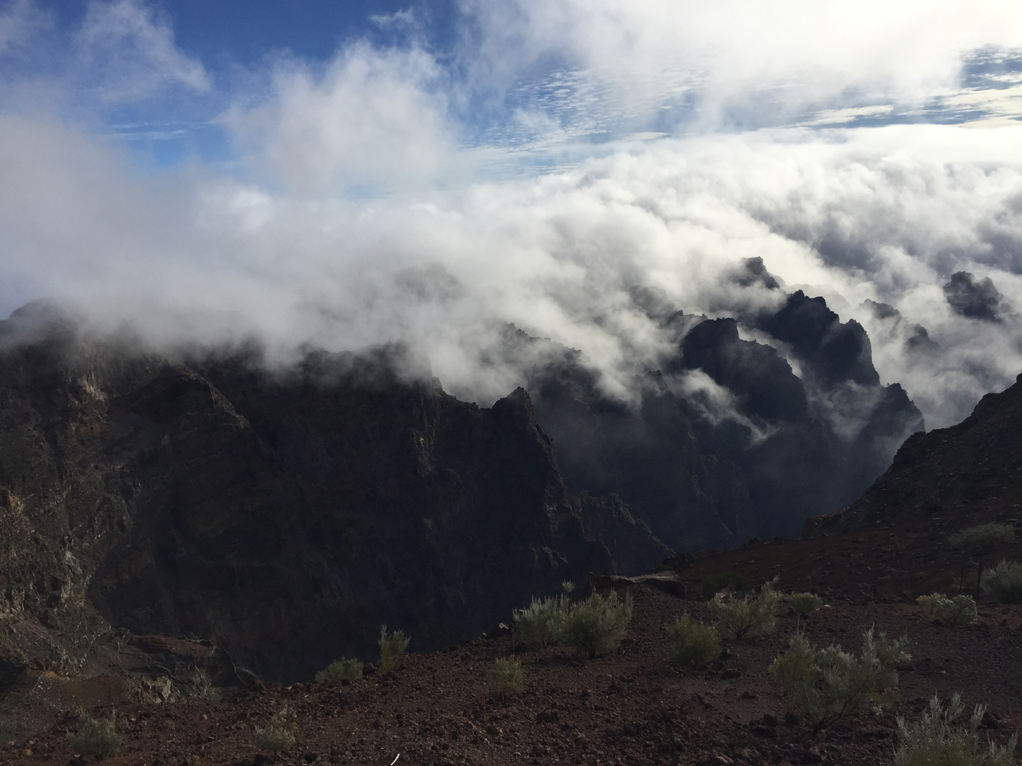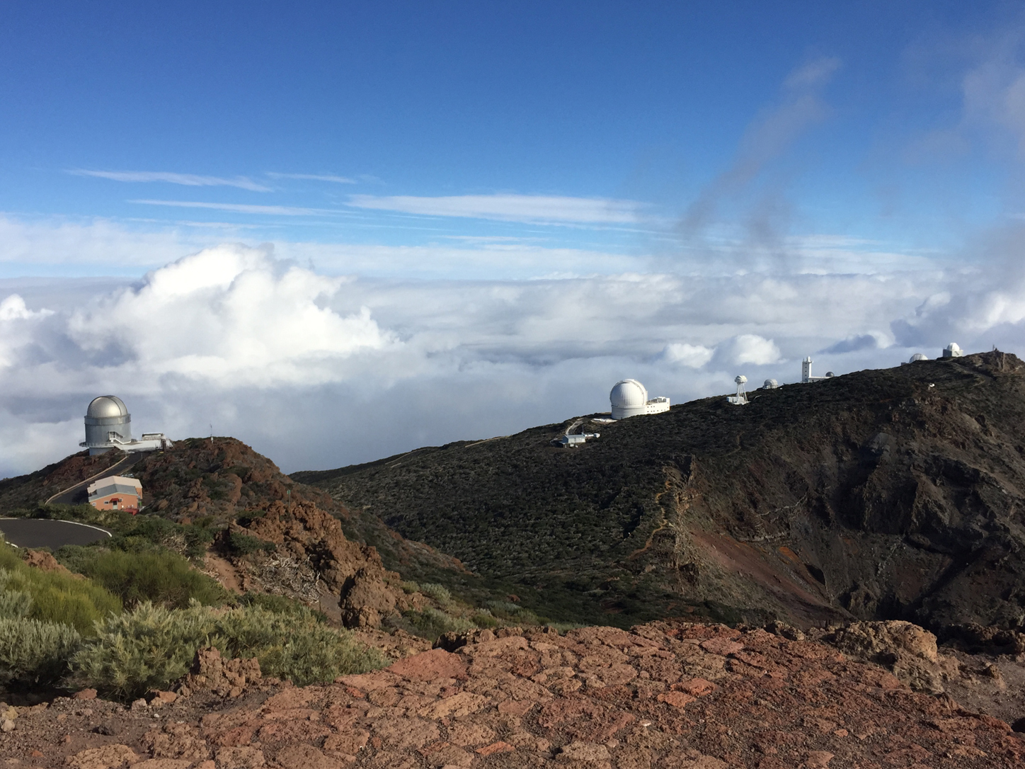 When we left La Palma, Transportation insisted on seeing the telescopes so instead of driving down the ravines and through the tunnel we went up and down the giant mountain with a quick stop at the top to see some clouds and shiny domes. Let me illustrate: