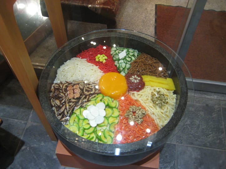 There are countless restaurants in Seoul since eating is the national past-time but because the city is a bit chaotic in its layout and function, it's very hard to get directions anywhere. We tried looking up restaurants online a few times but the addresses were usually so vague that you wanted to give up before you even started: \"In Insa-dong, behind the post office there's a little alley, look for the yellow sign.\" What?! Once we did find and follow an online recommendation though: for Seoul's best bibimbap. That's one of the dishes Korean cuisine is famous for and it's basically rice, veggies and meat topped with a raw egg. It's all beautifully arranged in a bowl when they bring it to you and then you stir it all up into a big mess and enjoy. I forgot to take a picture of our bowls when they arrived (too hungry) but because the restaurant is famous for their bibimbap they had a huge fake bowl of it outside: