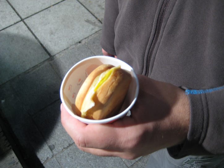 Basically it's a fried egg sandwiched between some batter. But it's SO good… The batter tastes vaguely sweet, almost like pancake or waffle dough so it's like brunch, in a cup. Can't go wrong there.