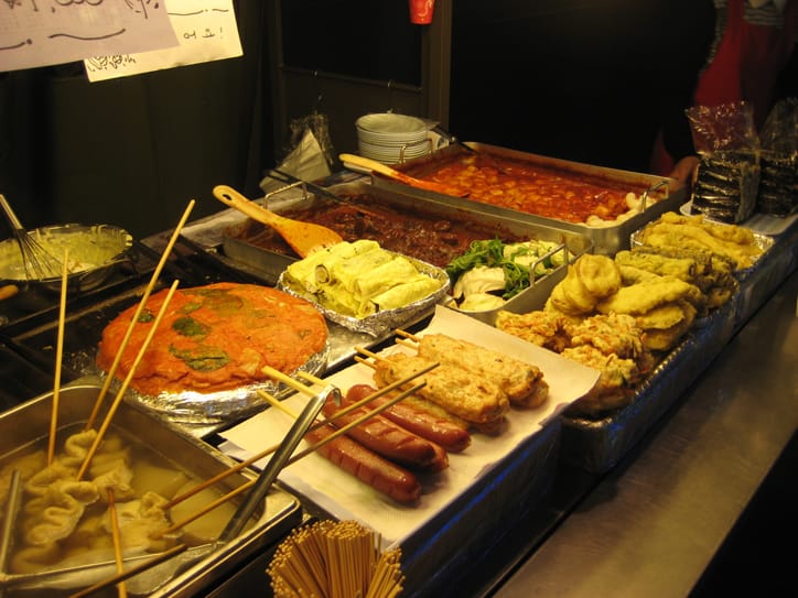 While we're on the subject of chicken, let's talk about food. Korean food is very good and if you stick to the smaller restaurants and street food vendors, it's not too expensive either. On the street our favourite snacks where egg-bread and sushi omelette. (I'm sure they have much nicer names in Korean but I have no idea what they are so egg-bread and sushi omelette it is.) Here's the egg-bread, served in a cup for some strange reason:
