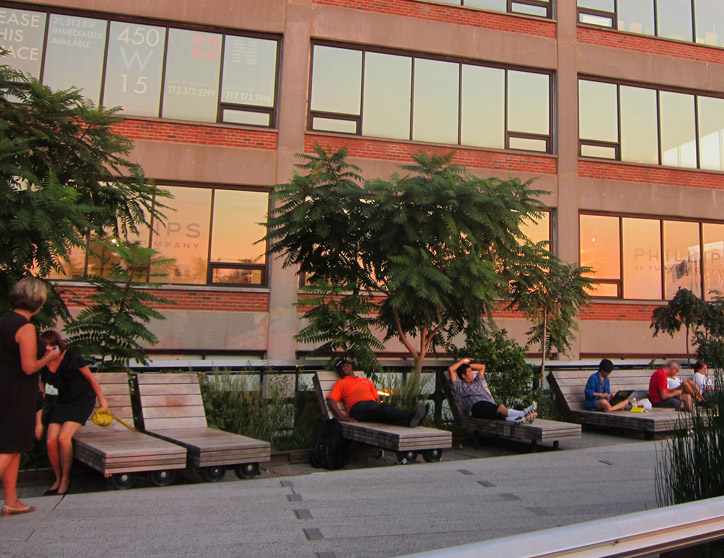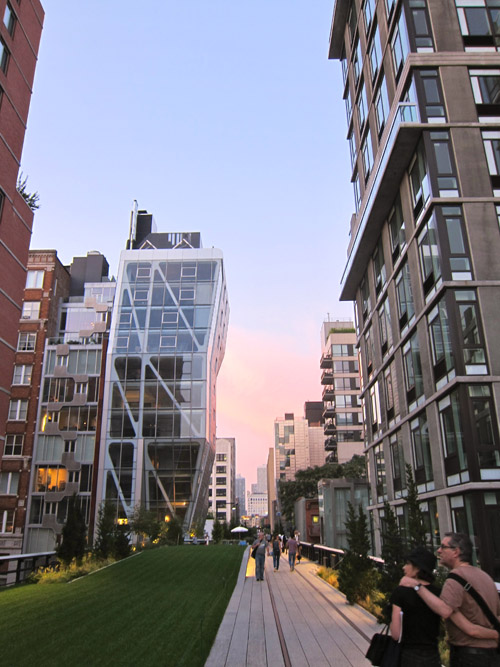 We haven't done too many touristy things yet (tomorrow, really, for sure!) but we did make it down to the Highline the other day just in time for sunset. The highline is a park built on an old elevated train line originally used to get freight trains off the city streets. It roughly runs from 12th St along 10th Ave all the way up to 30th St. The tracks are still visible in most places and have been incorporated into the park design with some beautiful results.